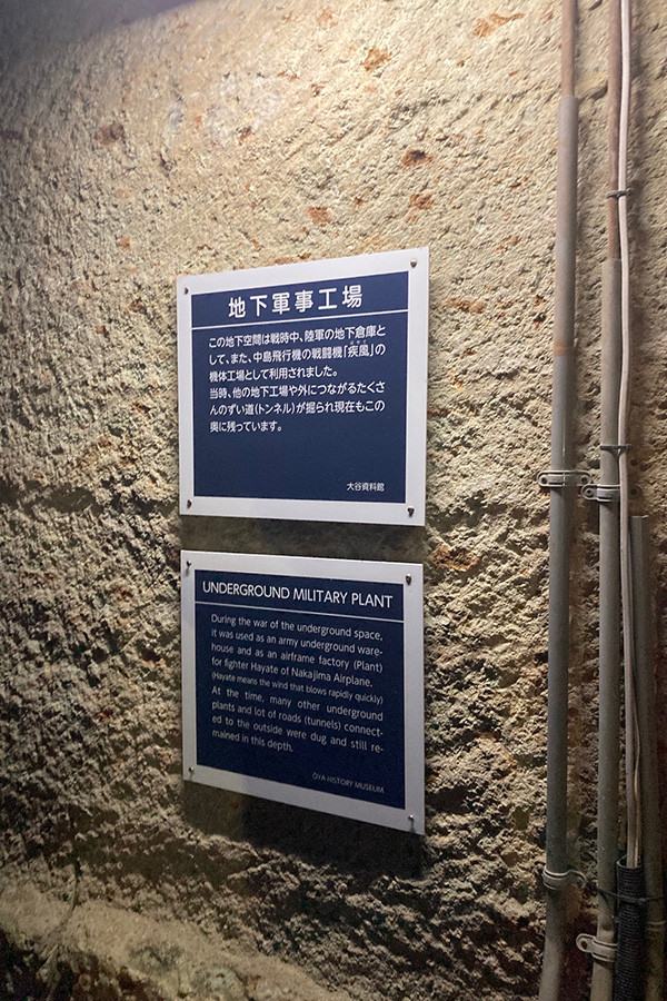 この大谷地区は、戦火が激しくなった昭和20(1945)年3月頃、米軍機の攻撃を避けるため、工場疎開が行われた。現在大谷資料館となっている地下坑内と近くの戸室山に、中島飛行機(株)の地下工場がつくられ、戦闘機「疾風(はやて)」などの生産を開始した。この2つの工場には約1万5000人が勤務していたとされる。資料館の見学コースでは、当時の地下工場跡の一部を見ることができる。